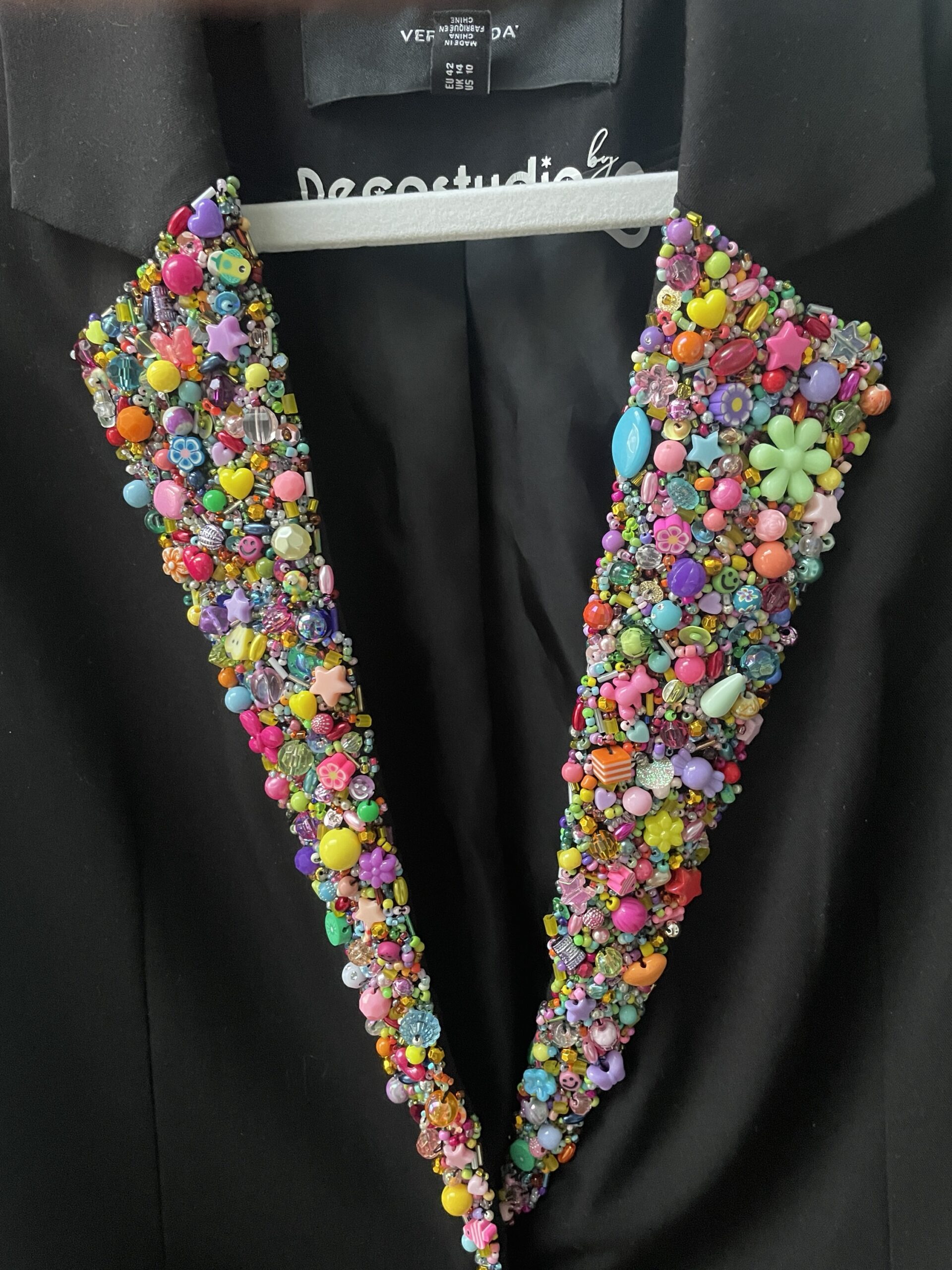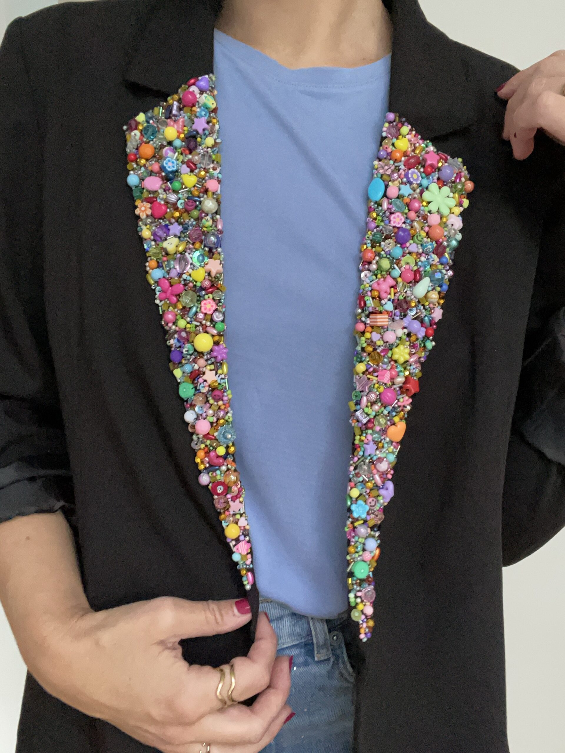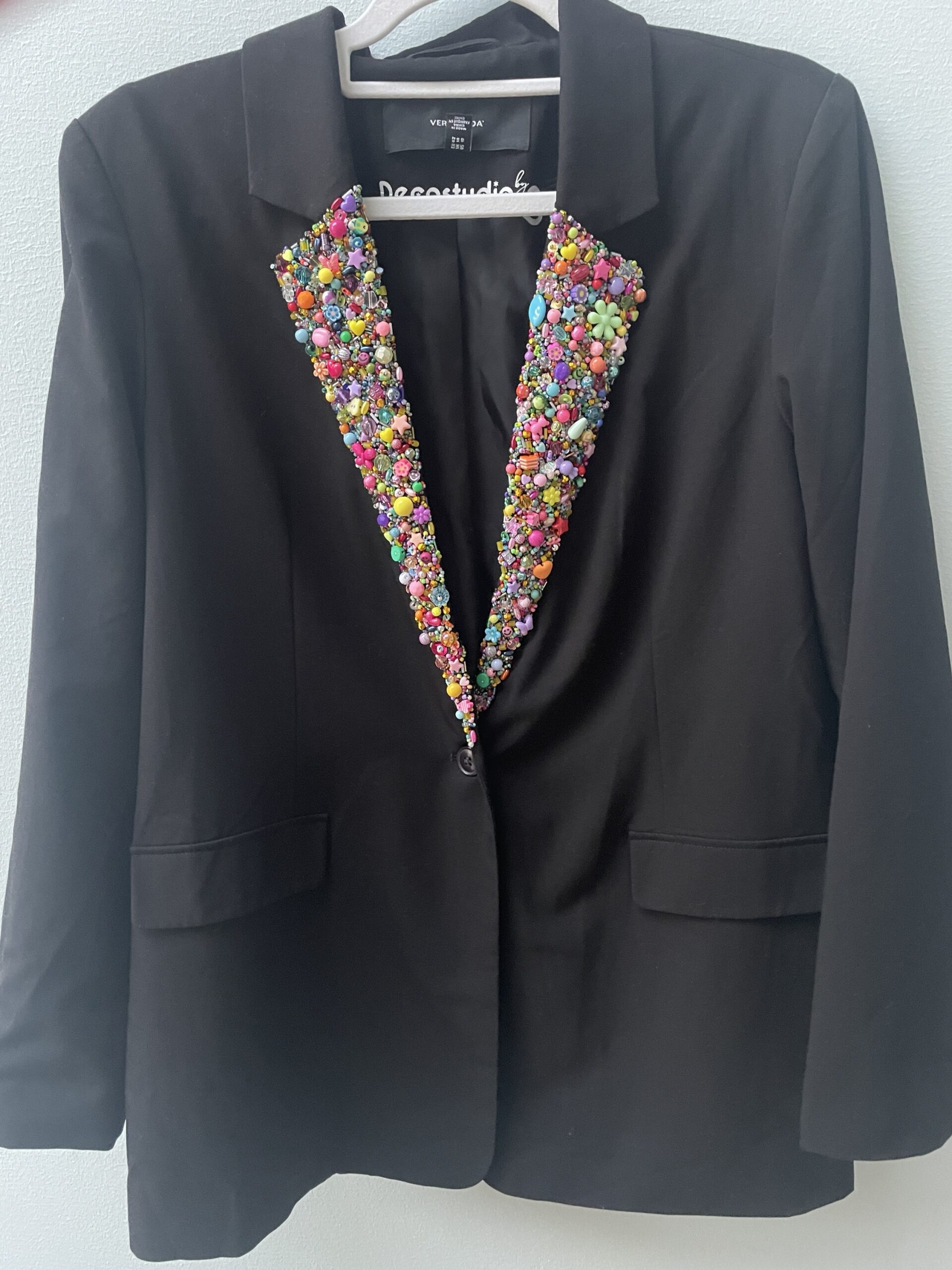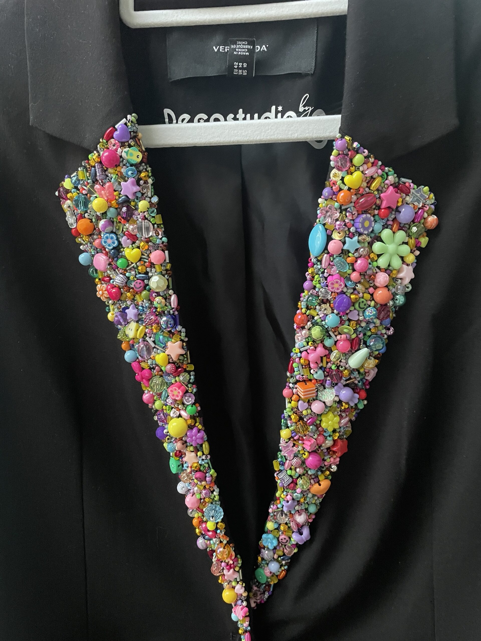 Vidunderlig redesignet blazer med full on håndsyede perler i forskellige materialer.