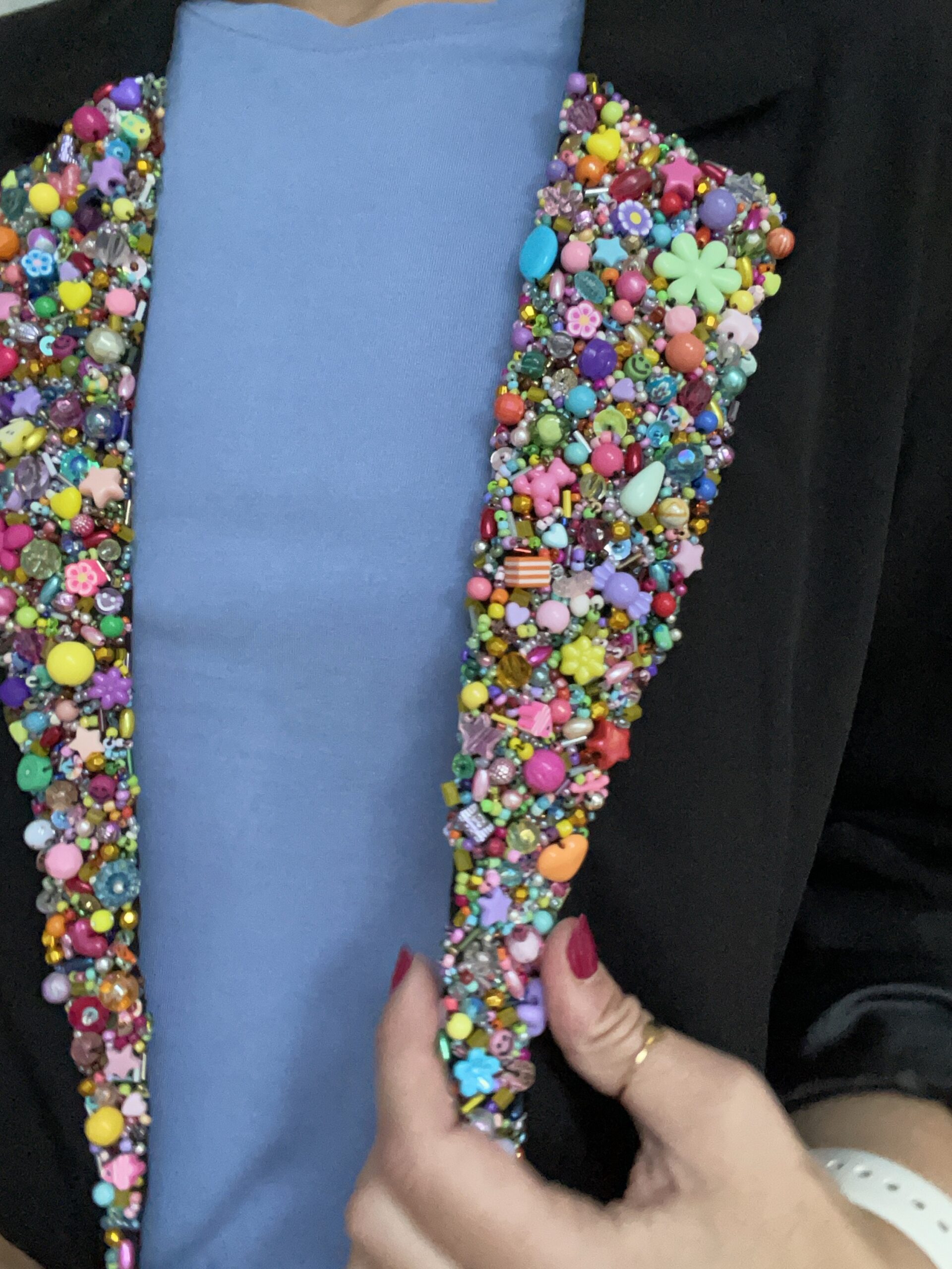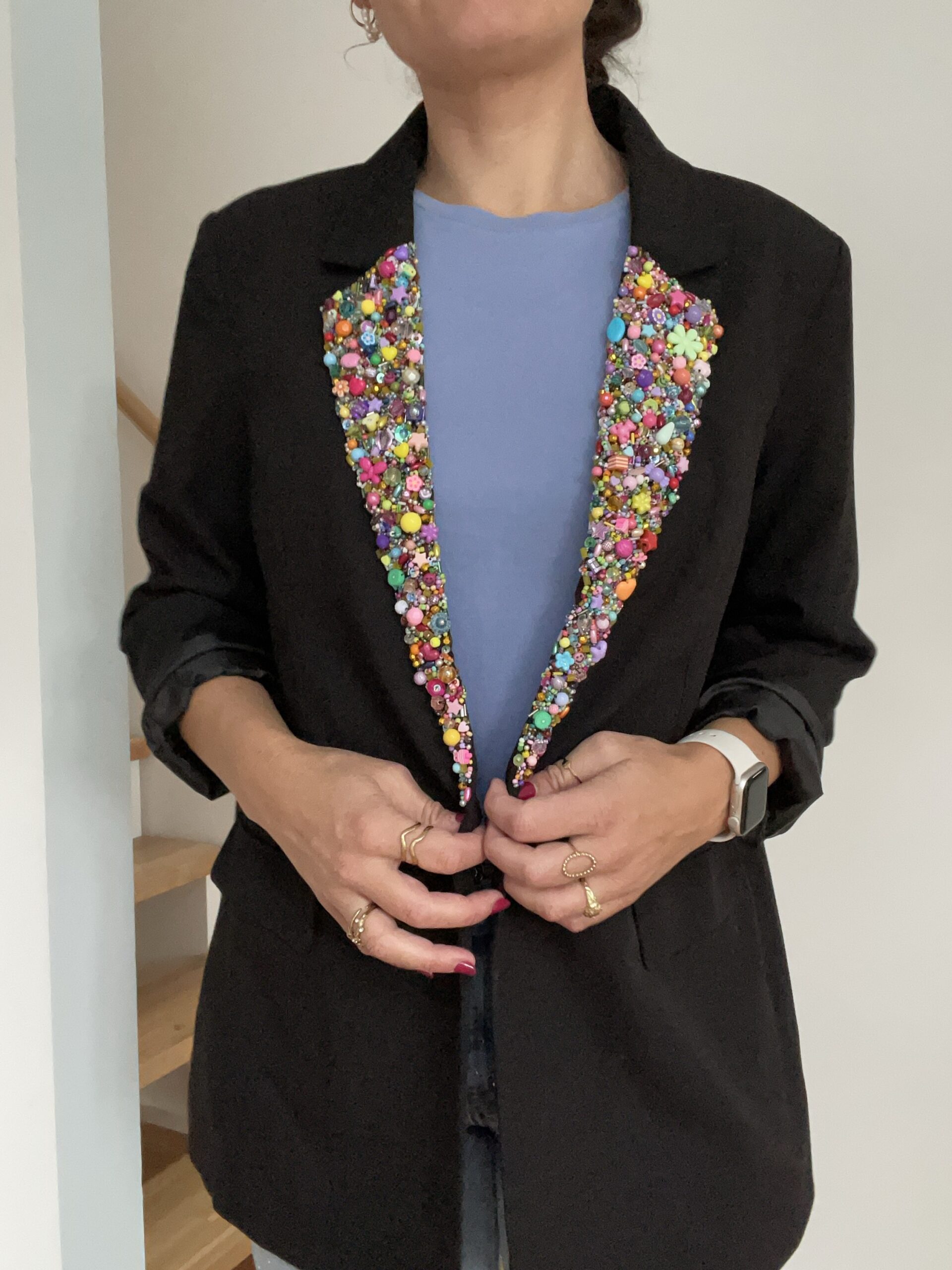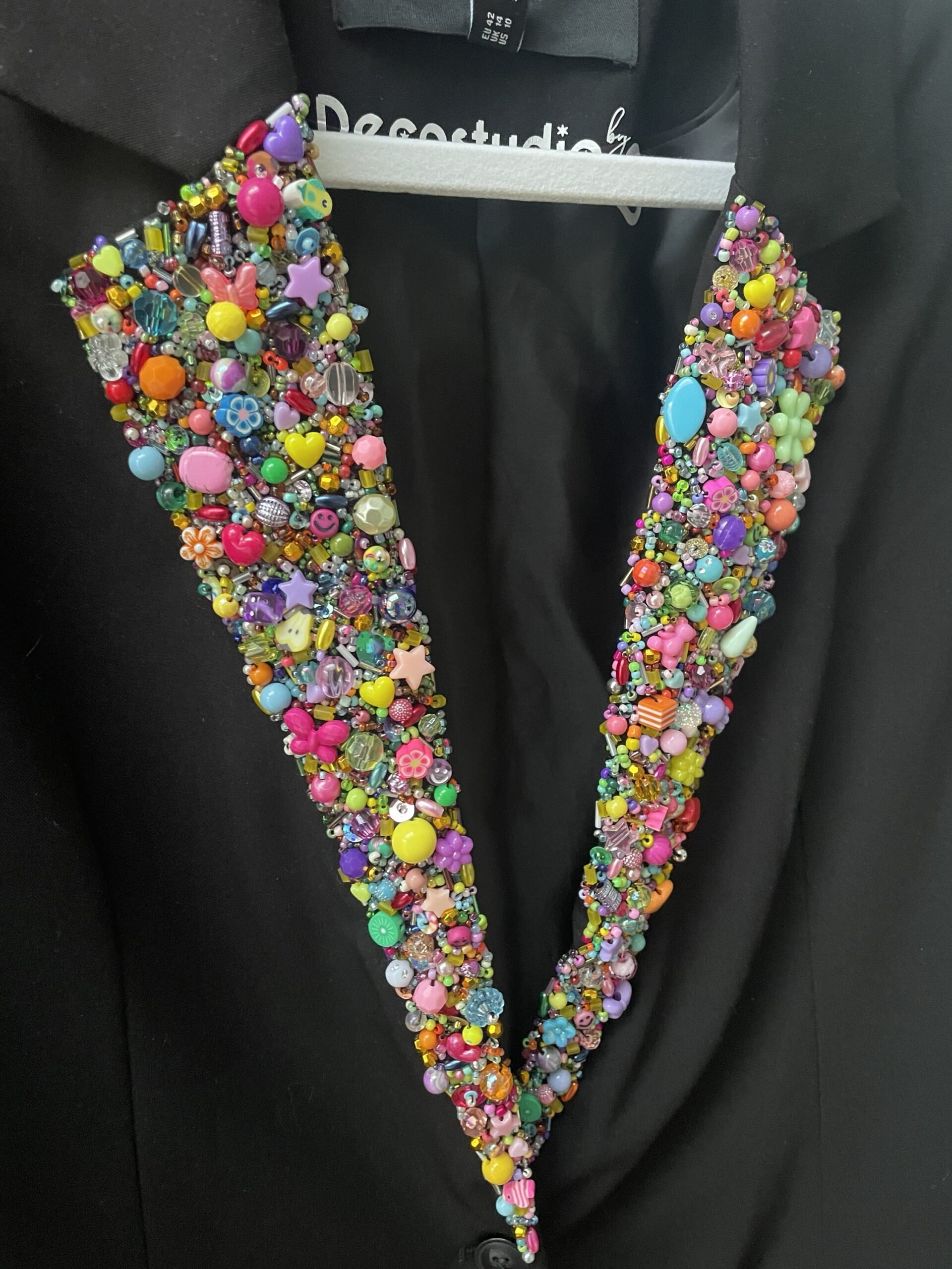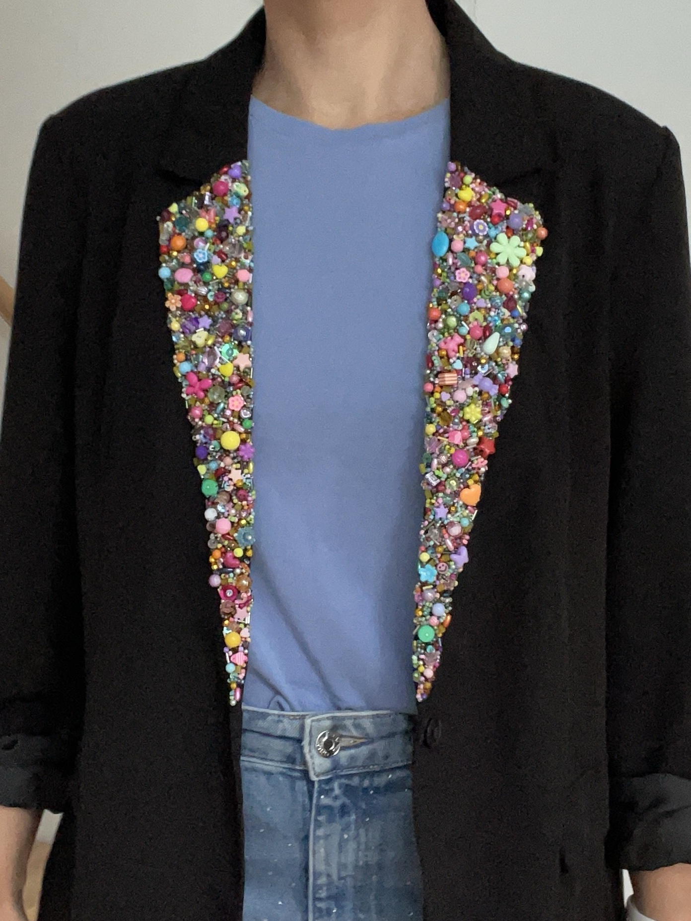 Vidunderlig redesignet blazer med full on håndsyede perler i forskellige materialer.