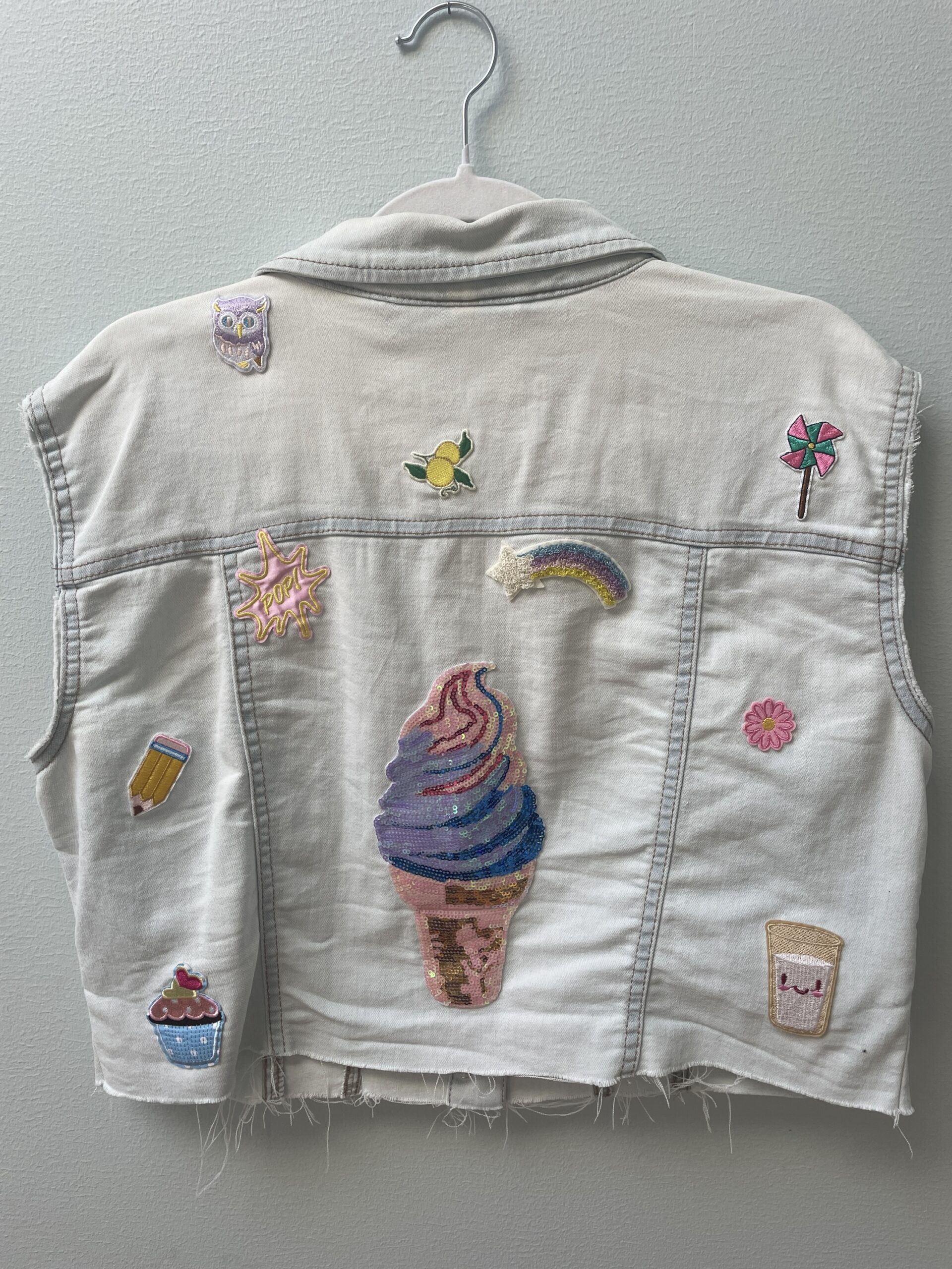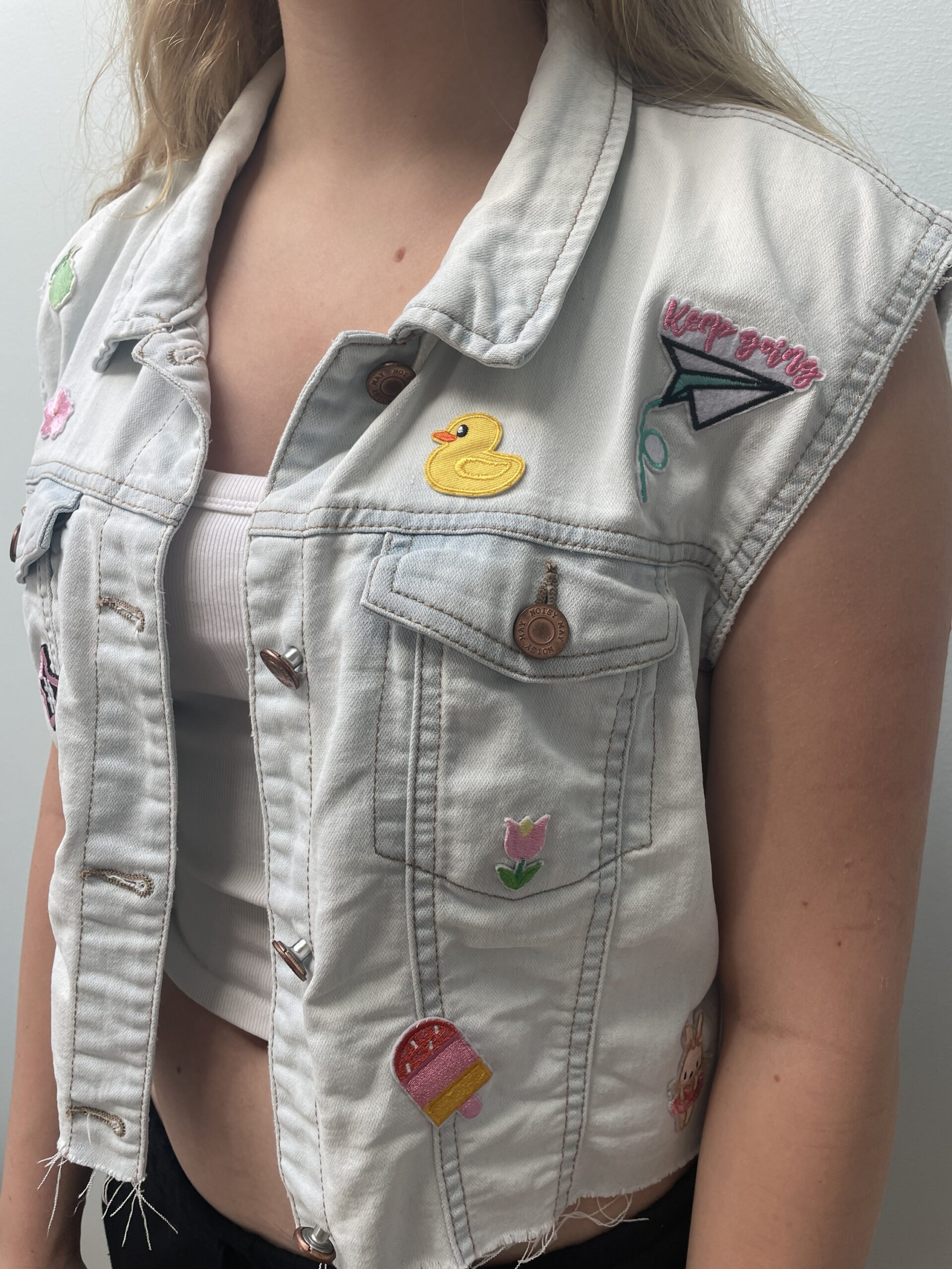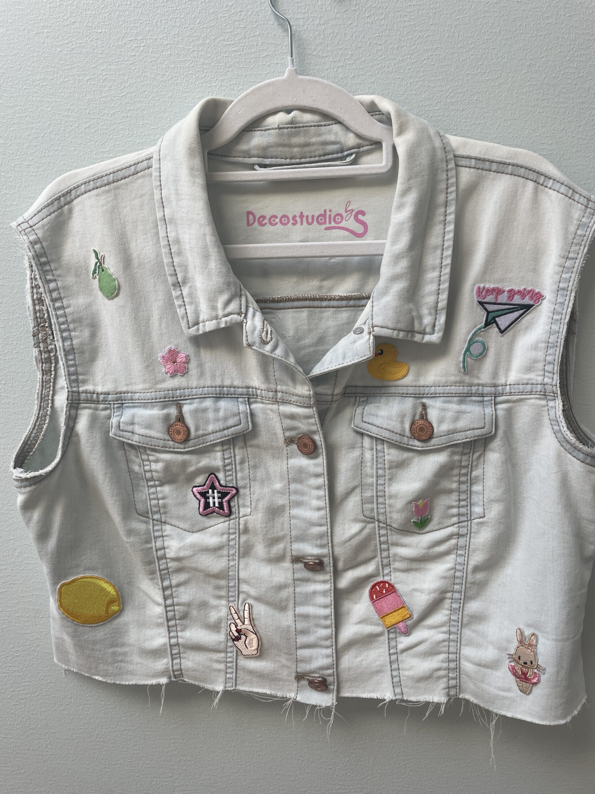 Super fin denim vest med en masse applikationer som er håndsyet på.