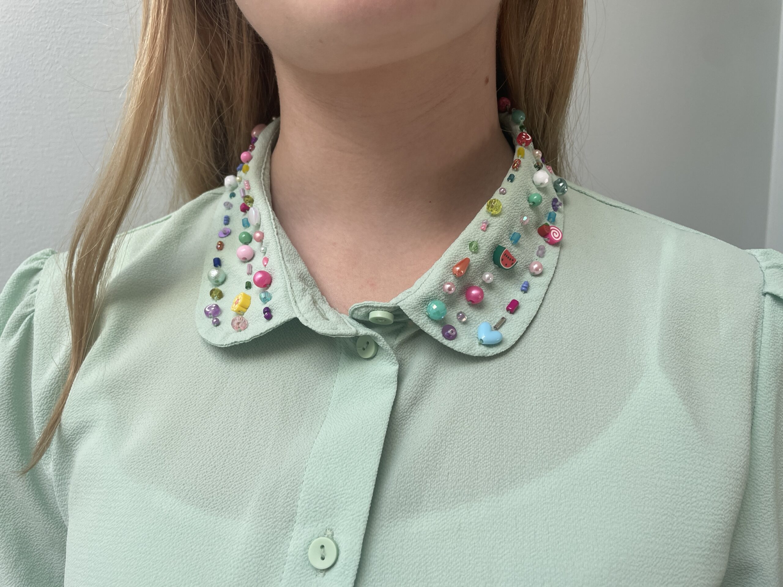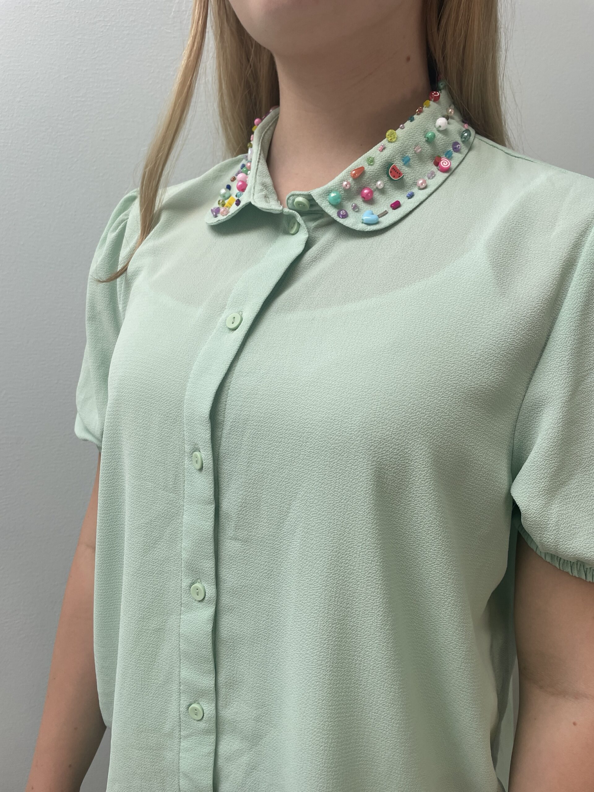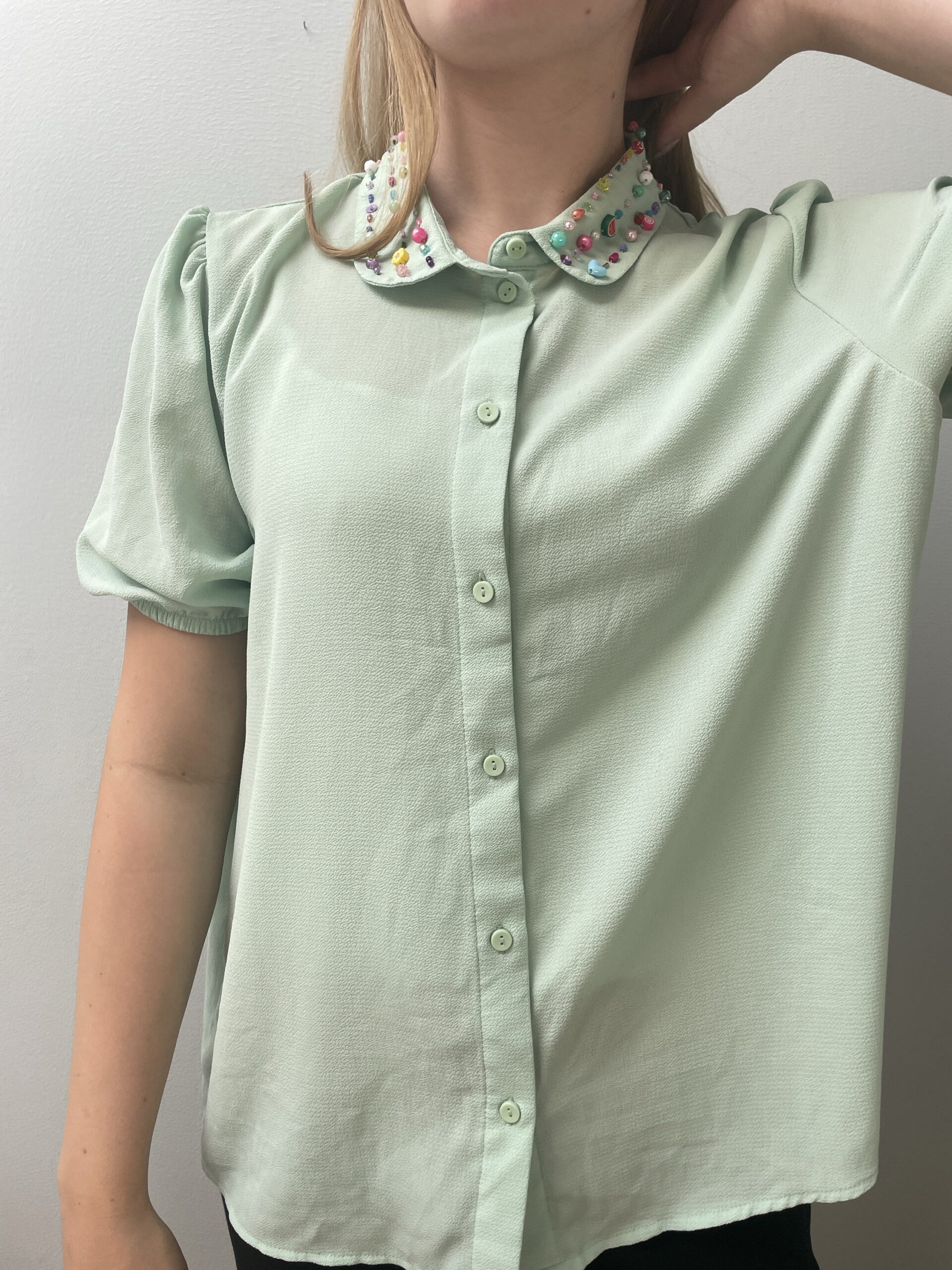 Pre-loved chiffon skjorte med håndsyede perler og pailletter i funky perle design. Skjorten er unika og rigtig sød under fx en blazer eller strik.