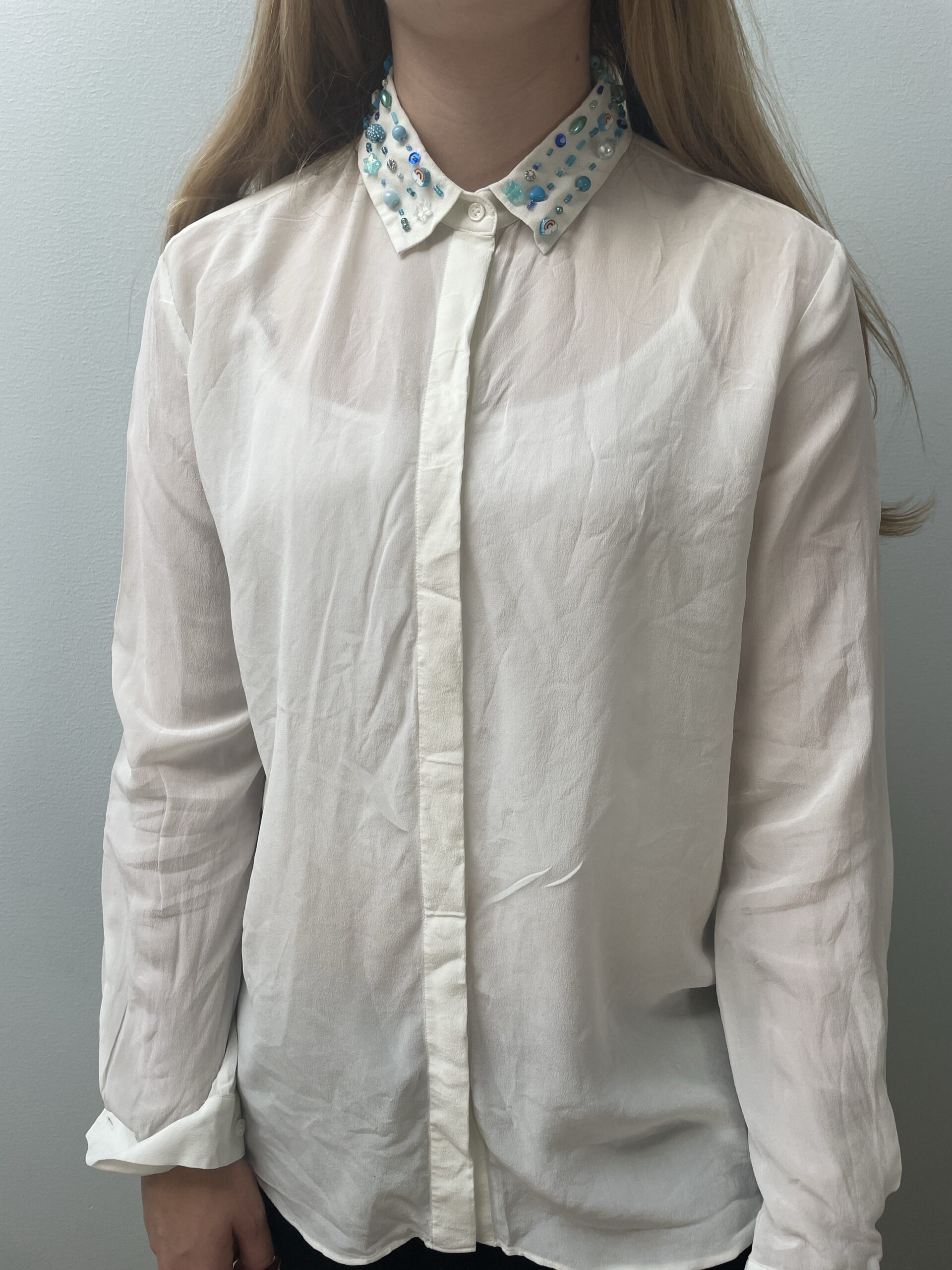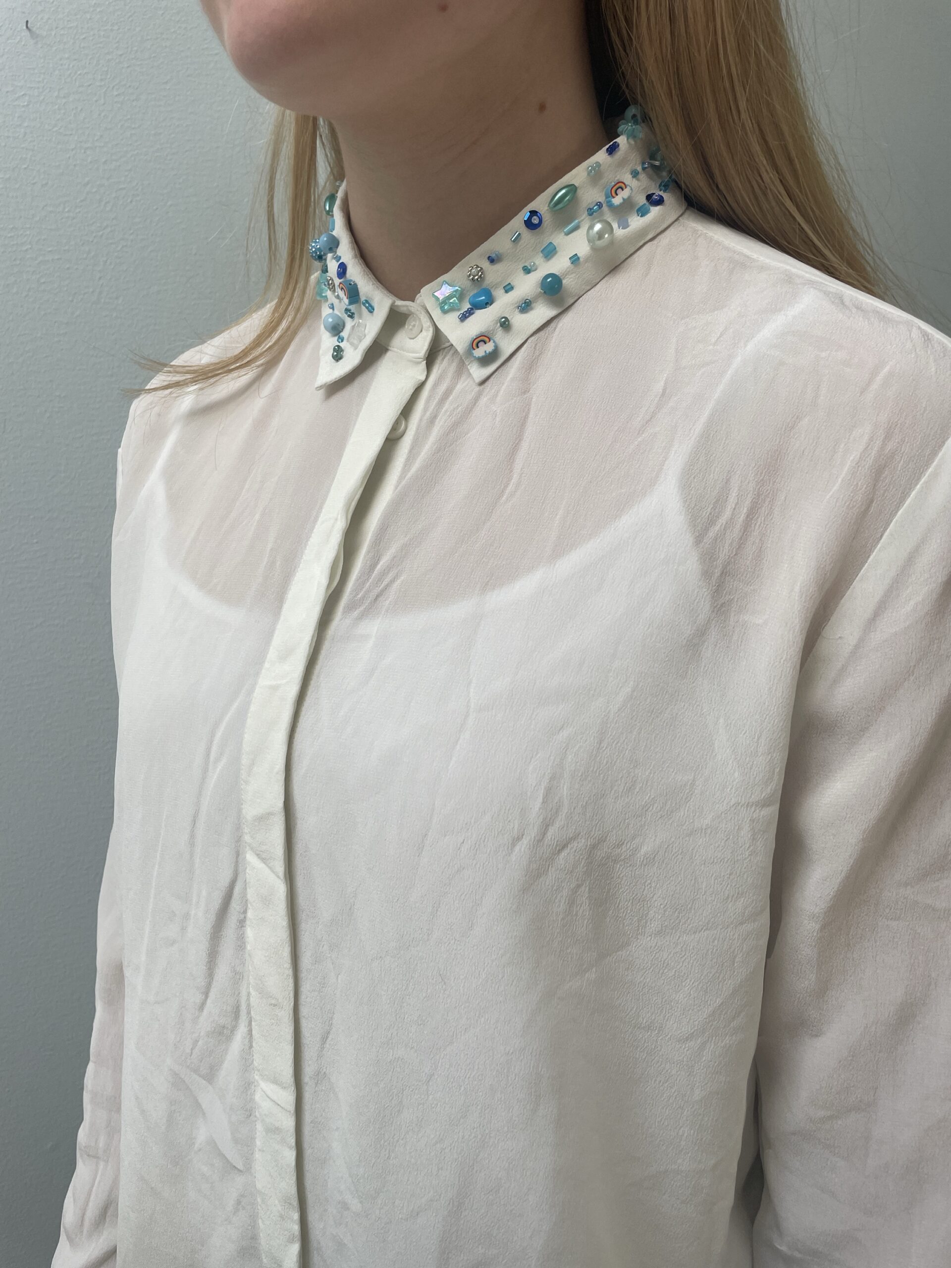 Pre-loved silke skjorte med håndsyede perler og pailletter i perle design holdt i blå nuancer.