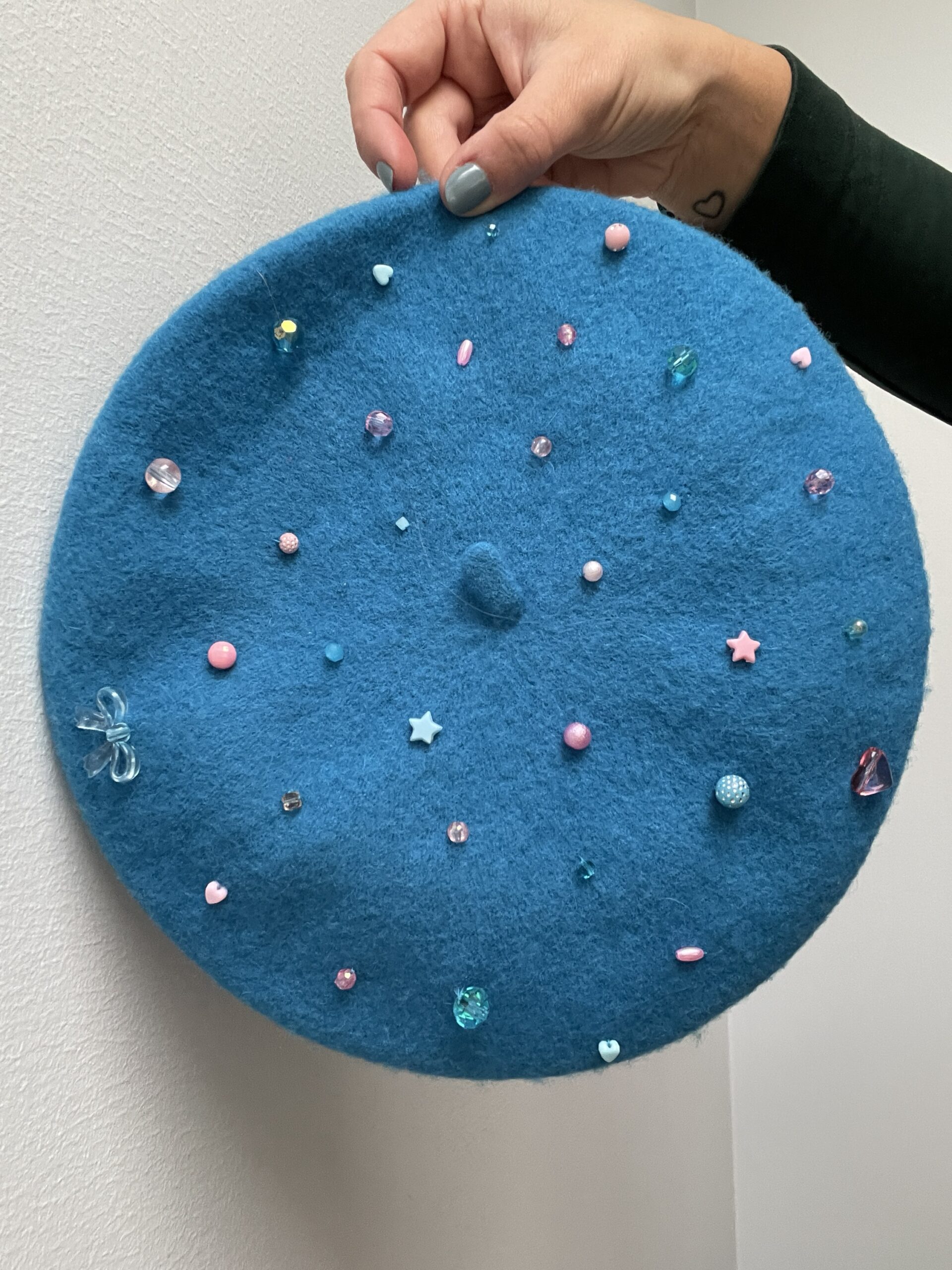 Hatten – eller huen om man vil, er fundet secondhand og perlerne er håndsyet. Total unika og ikke 2 er ens.