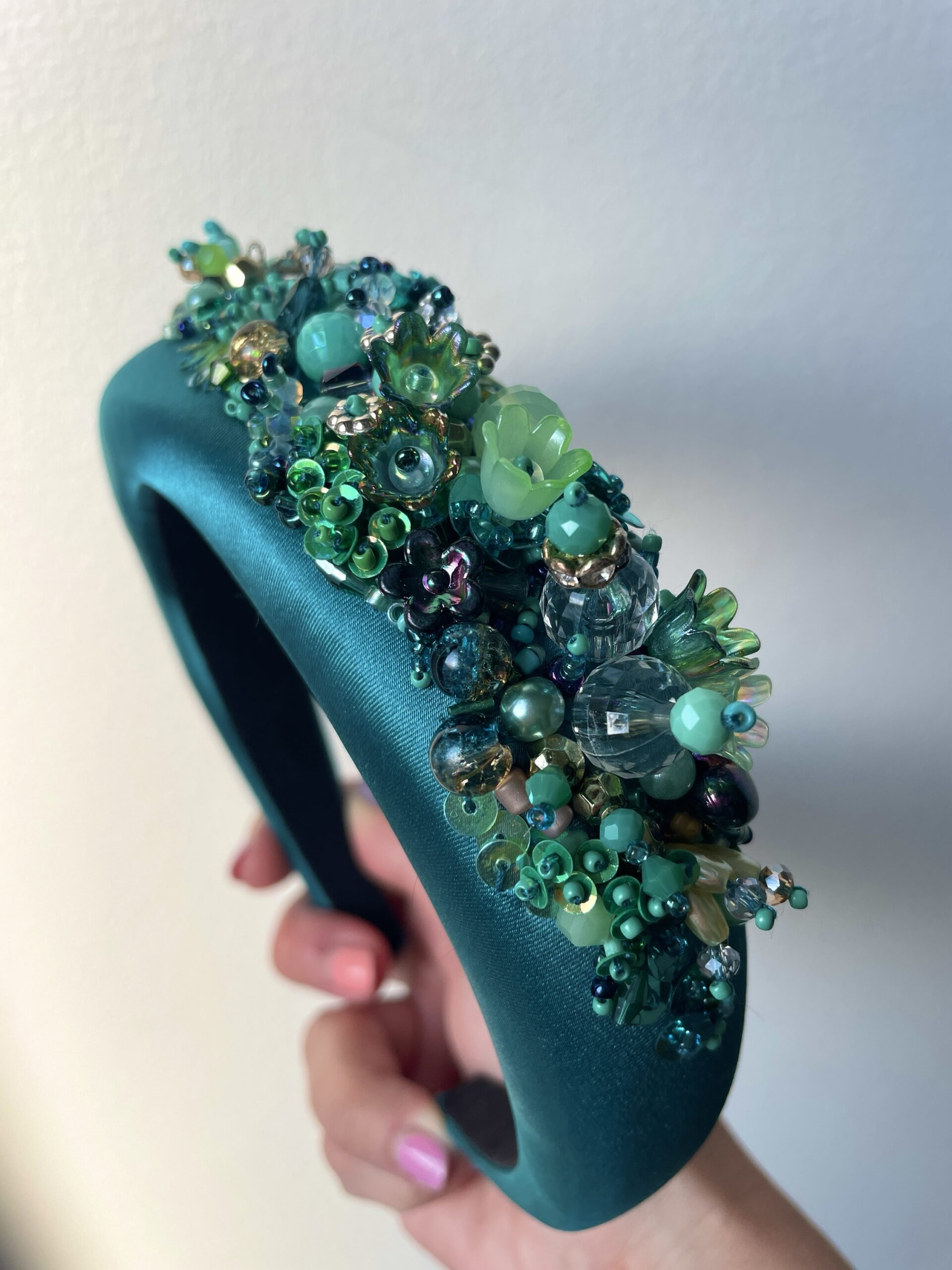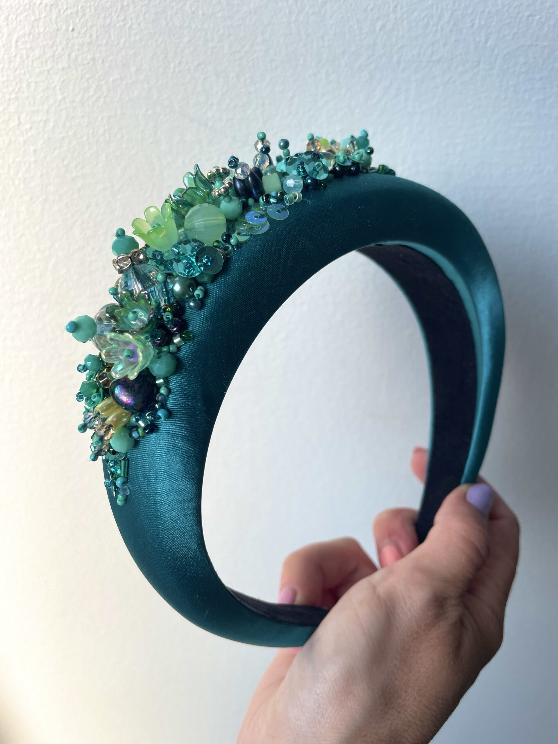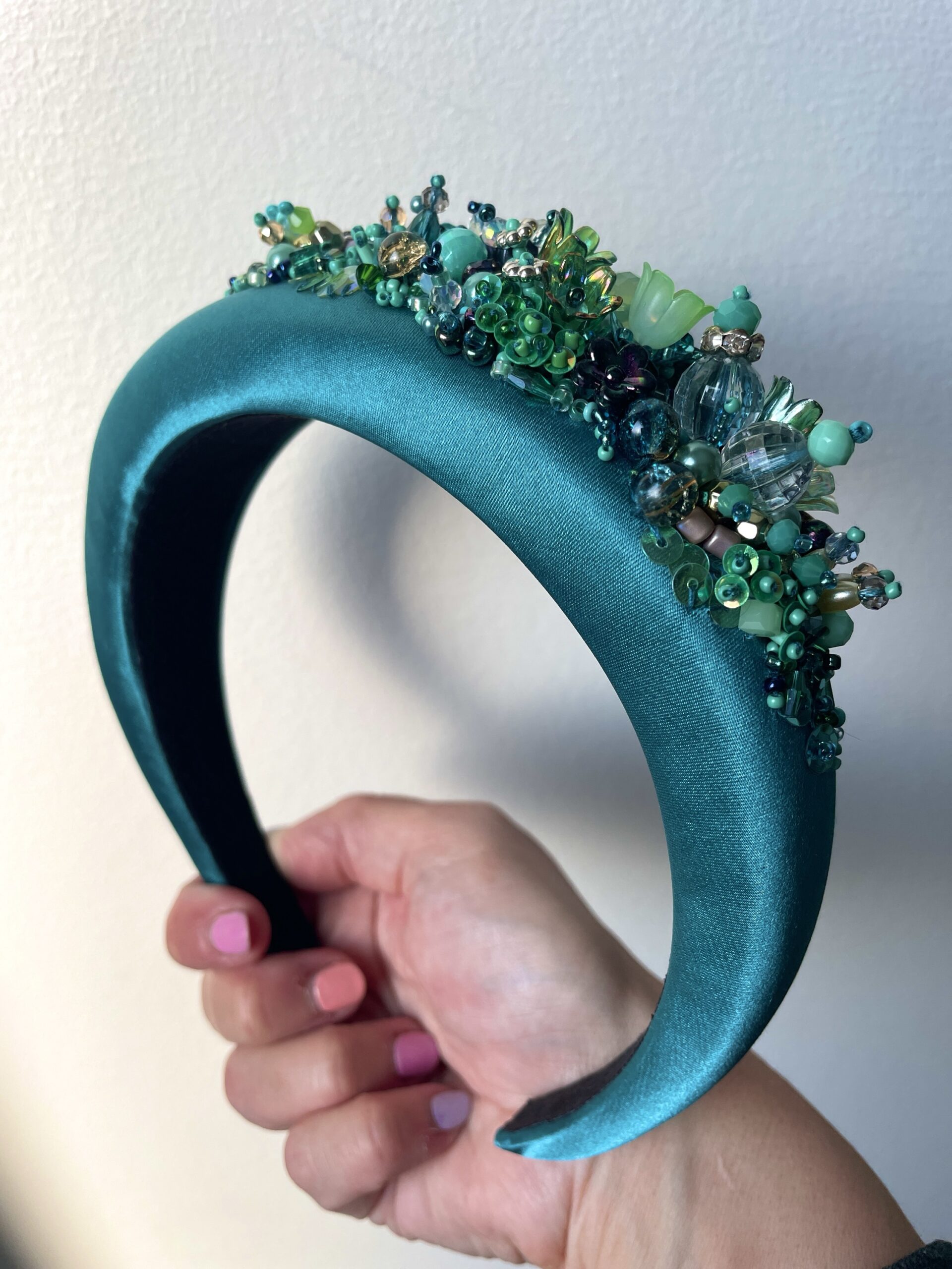 Hårbøjle i stof med fine perler og pailletter i et smukt koral lignende design med turkise og grønne perler i alle former og materialer.